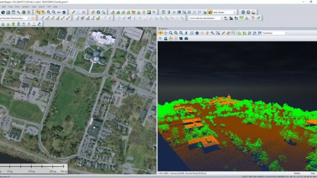 Với plugin LiDAR Module, Global Mapper tăng tốc quá trình xử lý nhờ thuật toán Phân lớp tự động AI classification và Trích xuất các đặc tính đối tượng feature extraction chuyên sâu.