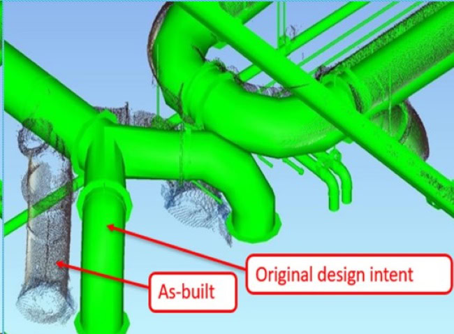 So sánh từ dữ liệu quét (thực tế) với dữ liệu mô hình thiết kế (BIM) giúp dễ dàng phát hiện sự sai khác.